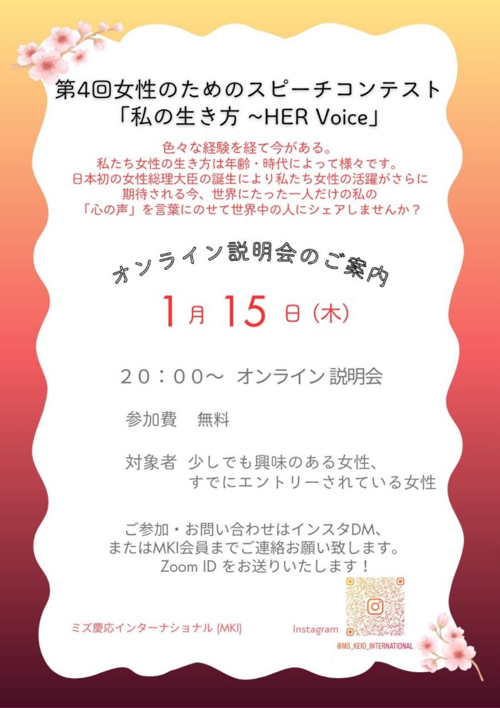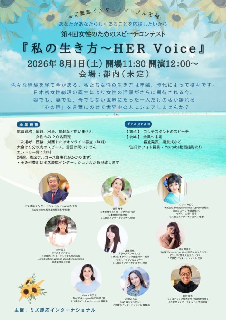 2023、2024、2025年度と開催された、ミズ慶應インターナショナル主催、女性のためのスピーチコンテスト《私の生き方~HER VOICE》が、来年2026年度も開催が決定!